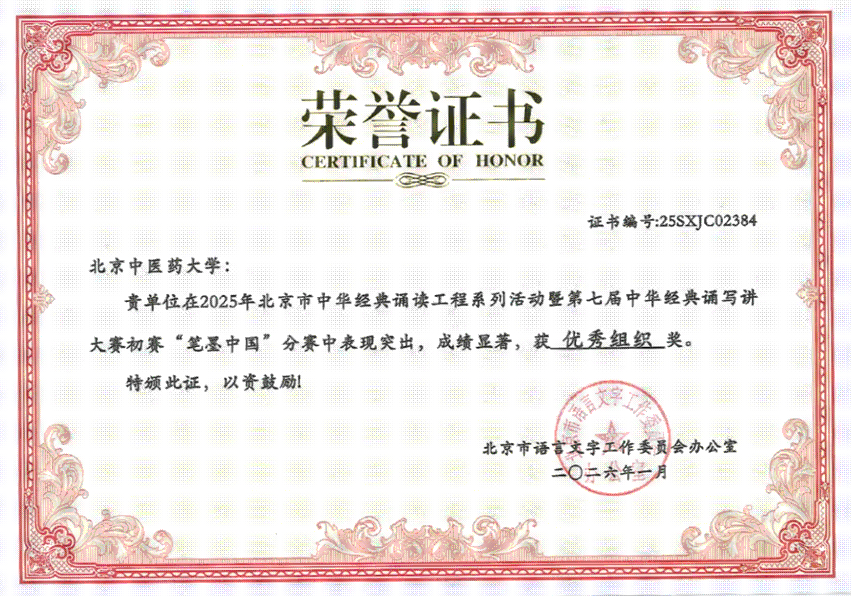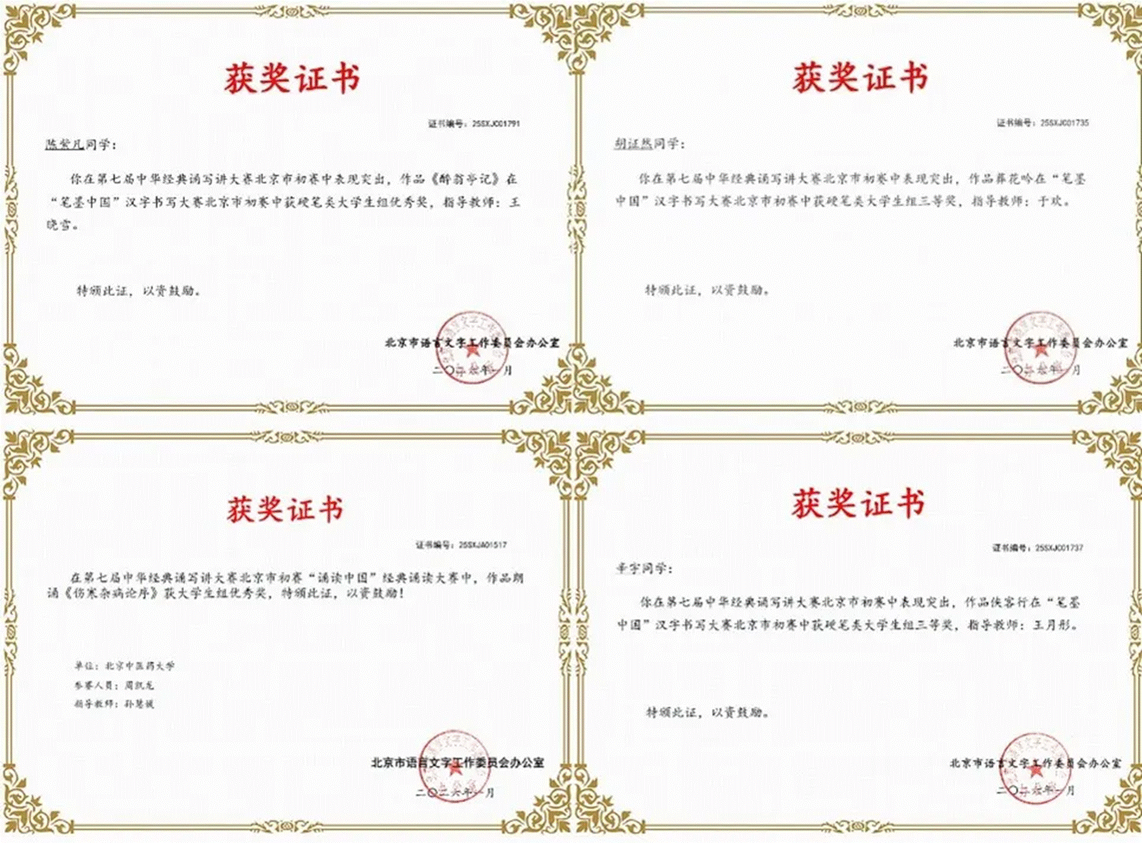近日,北京市教育委员会、北京市语言文字工作委员会公布了2025年北京市中华经典诵读工程系列活动暨教育部国家语委第七届中华经典诵写讲大赛北京市初赛活动评选结果,我校以出色的赛事组织与参赛学子的优异表现,在“笔墨中国”分赛中荣获优秀组织奖。9名参赛同学斩获市级奖项,其中三等奖3名、优秀奖6名,充分展现了北中医学子的文化素养与人文风采。