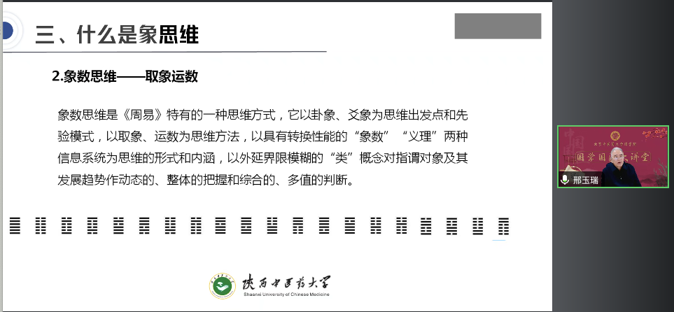 2024年10月24日晚,太阳成集团tyc41183国学国医大讲堂邀请邢玉瑞教授做题为《中医思维的相关概念辨析》的专题讲座。邢玉瑞教授是陕西中医药大学二级教授,博士生导师,现任陕西中医药大学文化文献研究院院长,中华中医药学会中医基础理论分会副主委、中国哲学史学会中医哲学分会副会长、世界中医药学会联合会中医临床思维专委会副会长等职务,是国家中医药管理局及陕西省重点学科中医基础理论学科带头人。他长期从事《黄帝内经》《中医基础理论》《中医思维方法》《中西医学比较》等教学和科研工作,先后主编、参编学术著作及教材50余部,发表学术论文210余篇,主持“973”项目课题、国家社科基金项目及省级科研课题10余项,先后获得国家优秀教学成果二等奖、陕西省优秀教材二等奖等奖项。本次讲座以线上形式进行,来自我校、兄弟院校师生及社会各界国学国医爱好者2000余人收听了讲座,讲座由太阳成集团tyc41183副院长李蔓荻主持。